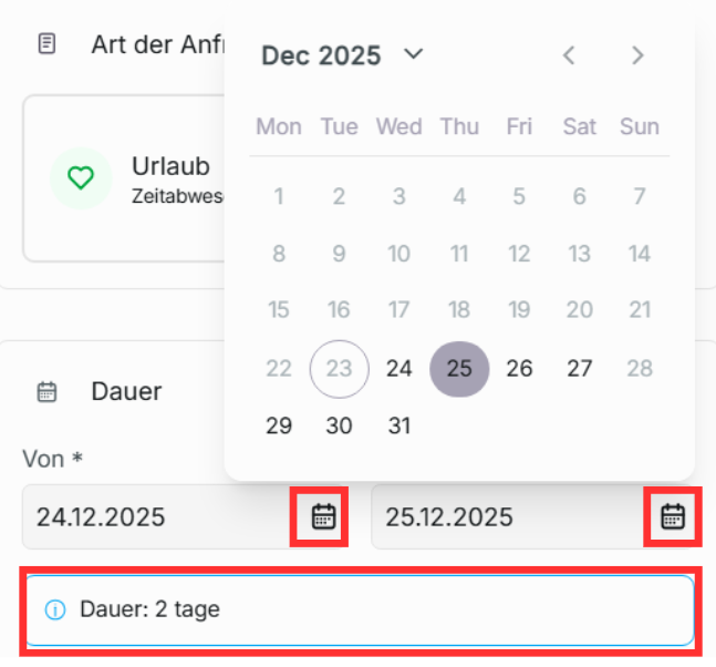 Sie können eine Abwesenheitsanfrage für einen Urlaub-Anfragetyp nur mindestens einen Tag im Voraus erstellen.