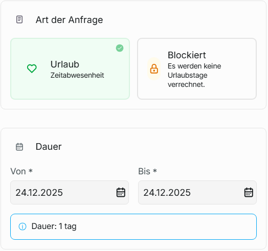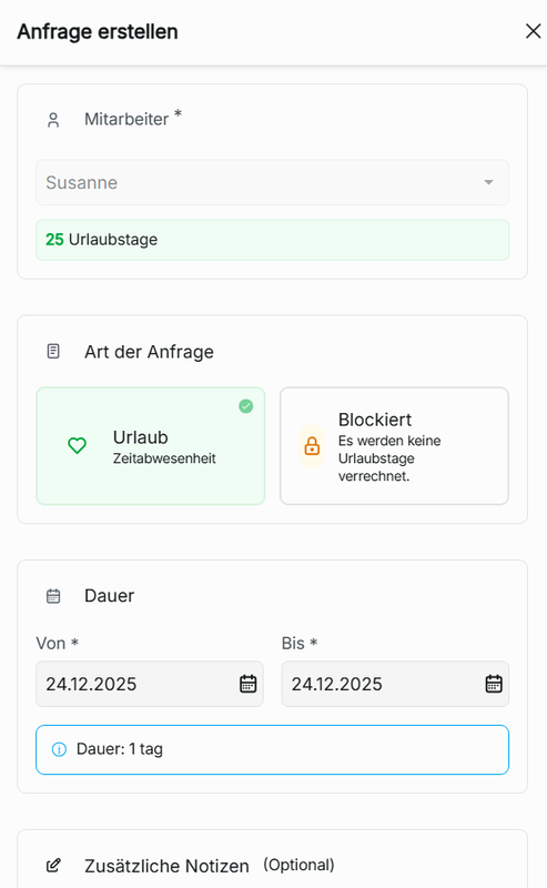 Dieser Anfragetyp wird nicht von den verbleibenden Urlaubstagen des Mitarbeiters abgezogen.