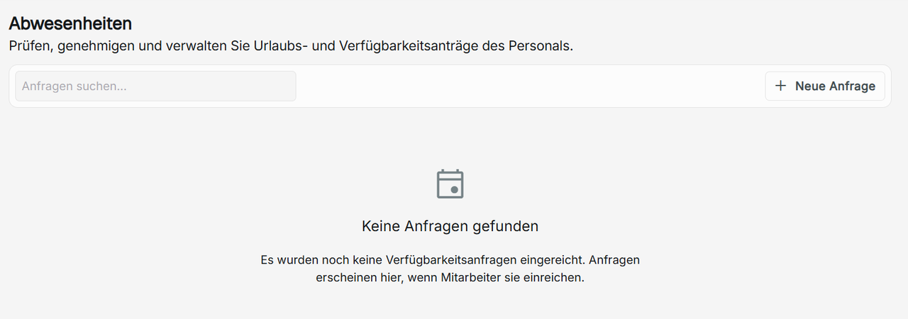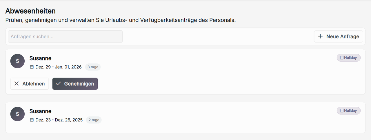 Jede Abwesenheitsanfrage, die von der Inhaber- oder Admin-Rolle erstellt wird, wird automatisch vom System genehmigt.