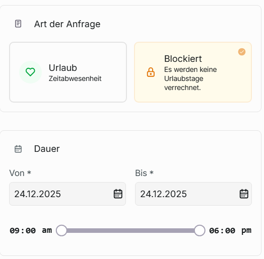 Wählen Sie die Freizeit-Dauer des Mitarbeiters mit den Kalendern neben „von" und „bis". Wenn das Von- und Bis-Datum bei einer Anfrage für Blockiert gleich ist, können Sie Stunden innerhalb des Kalendertages angeben, die für geplante Buchungen blockiert werden sollen.
