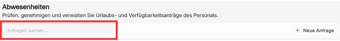 Um nach einer bestimmten Abwesenheitsanfrage zu suchen, verwenden Sie die Anfragen suchen-Suchleiste. Sie können nach Name oder Anzeigename, Anfragetyp (Urlaub oder Blockiert) und Inhalt der Notizen suchen.