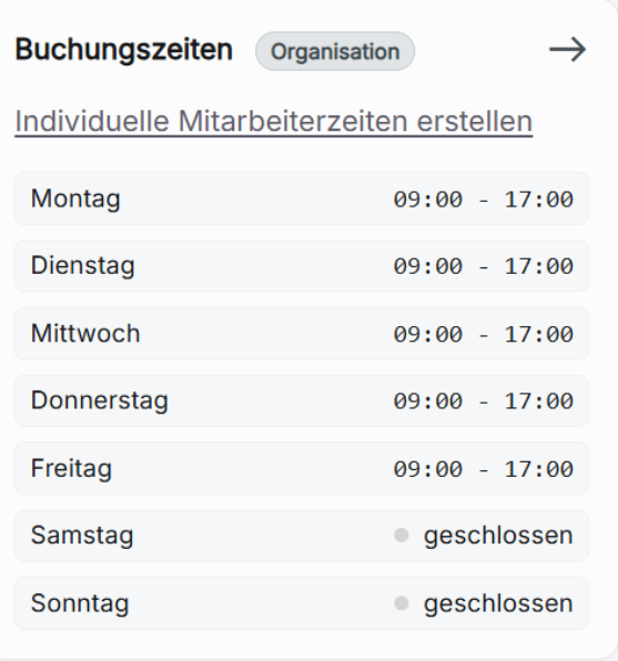 Beachte: Nach dem erstmaligen Hinzufügen eines Mitarbeiters werden zunächst die Buchungszeiten der Organisation, (bzw. der Filiale, wenn für diese individuelle Buchungszeiten hinzugefügt wurden) angewendet.