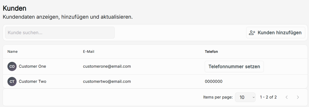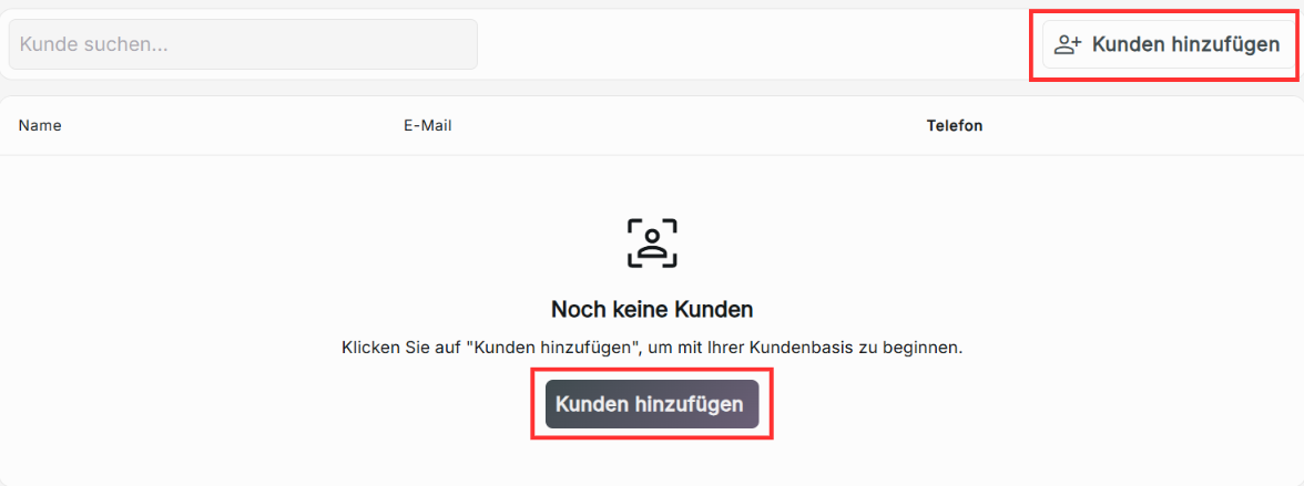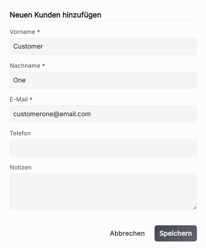 Um einen neuen Kunden hinzuzufügen, klicken Sie auf Kunden hinzufügen. Es ist erforderlich, den Vornamen, Nachnamen und die E-Mail-Adresse des Kunden hinzuzufügen, um ihn als Kunden zu registrieren. Die Telefonnummer wird empfohlen, ist aber optional. Klicken Sie auf Speichern, um die Kundenbasis zu aktualisieren.