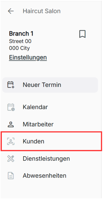 Hier können Sie Kunden anzeigen und hinzufügen. Sie können den Namen, die E-Mail-Adresse und die Telefonnummer bestehender registrierter Kunden anzeigen, wobei die angezeigten Kunden für jede Filiale geteilt werden. Mitarbeiter können nicht als Kunden zu einer Organisation hinzugefügt werden, zu der sie gehören.