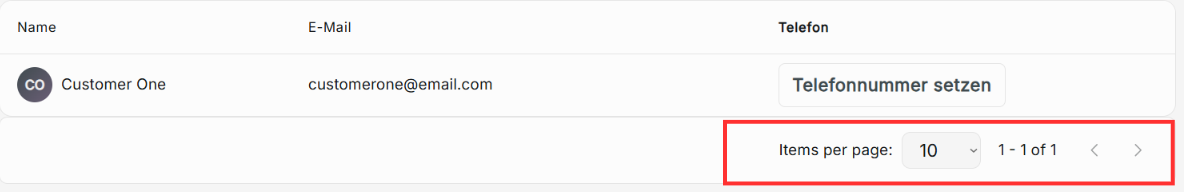 Wenn Sie eine hohe Anzahl registrierter Kunden haben, navigieren Sie durch die Kundenbasis mit den Pfeilen unter der Kundenliste, um durch die Seiten zu blättern. Sie können auch die Anzahl der Elemente pro Seite ändern, indem Sie auf das Dropdown-Menü klicken und zwischen 10, 25, 50 oder 100 wählen.