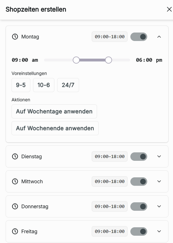 Similarly to creating the organization's shop hours, you can individually adjust each day's shop hours using the slider for each day and toggling days on and off. In the drop-down arrow, you can use presets for the shop's hours, and you can use actions to automatically apply the hours of the day you are adjusting to automatically copy the same hours by clicking, Apply to Weekends. When you are finished adjusting the booking hours in the pop-up, click Create at the bottom.