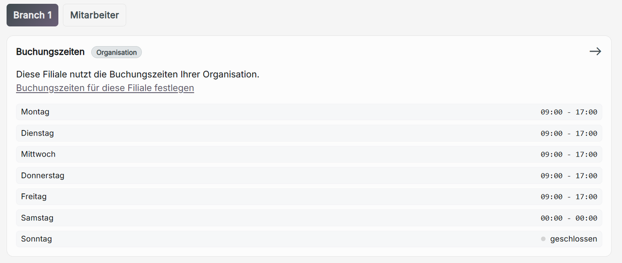 - Shop – The branch follows custom set booking hours separate from the organization.