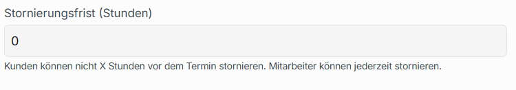- Cancellation notice (hours) - is for adjusting the amount of hours before a customer is unable to cancel. The customer cannot cancel within the number of hours set before their scheduled appointment. Staff can still cancel. The number inputted below refers to the amount of hours.