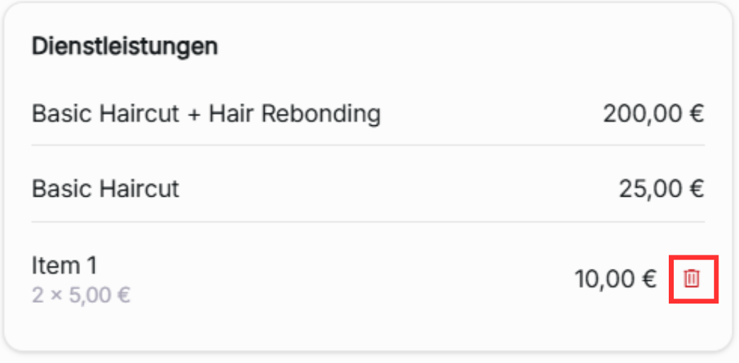 Artikel löschen – Während Sie sich noch in der Zahlungsverarbeitung befinden, klicken Sie auf das Löschsymbol neben dem Artikel, den Sie entfernen möchten.