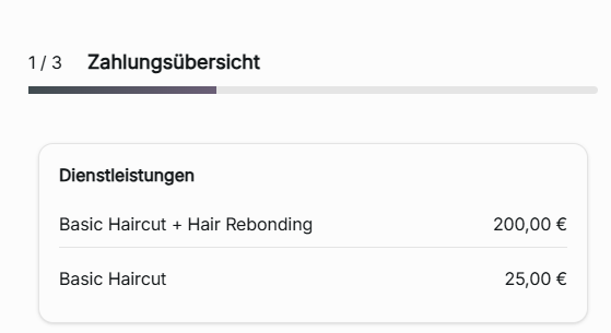 Sie gelangen zur Zahlungsübersicht, die die Dienstleistungen anzeigt, für die Sie bezahlen, mit dem Preis und dem Gesamtbetrag aller Dienstleistungen und Artikel, die optionale Zusatzzahlungen sind, falls für den Termin benötigt. Wenn ein Artikel hinzugefügt wurde, werden Preis und Menge des Artikels angezeigt. Der Artikel kann durch Klicken auf das Löschsymbol neben dem Artikel gelöscht werden.
