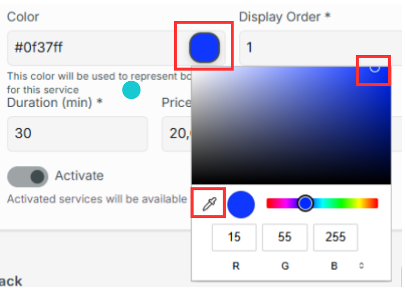 Du kannst eine Farbe auswählen, mit der diese Dienstleistung in deinem Buchungskalender angezeigt wird. Das hilft dir, bei vielen Dienstleistungen und Buchungen einen schnellen und übersichtlichen Überblick zu behalten. Um die Farbe zu ändern, kannst du entweder einen HEX-Wert direkt in das Farbfeld eingeben oder auf das Feld mit der aktuell ausgewählten Farbe klicken, um die Farbauswahl-Maske zu öffnen.