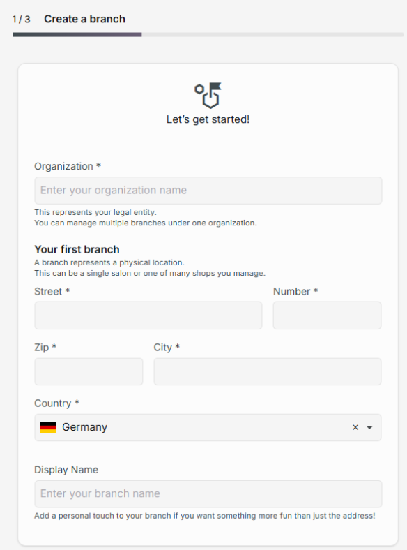 Zunächst gibst auf dem Level der Organisation den Namen deines Gewerbes an. Anschließend kannst du deine erste Filiale erstellen, indem du die Adresse (erforderlich) eingibst sowie einen Anzeigenamen (optional) für deine Filiale wählst (So wird deine Filiale in der zynday App benannt und angezeigt).