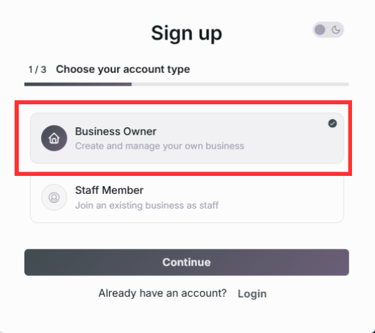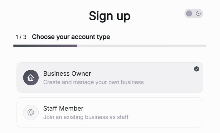 Anschließend musst du einen Kontotyp wählen, entweder Geschäftsinhaber oder Mitarbeiter. Beachte: Damit du dich als Mitarbeiter eines bestehenden Accounts für ein Geschäft registrieren kannst, musst du zuvor durch einen Administrator (in der Regel: Inhaber) eine Einladung erhalten haben.