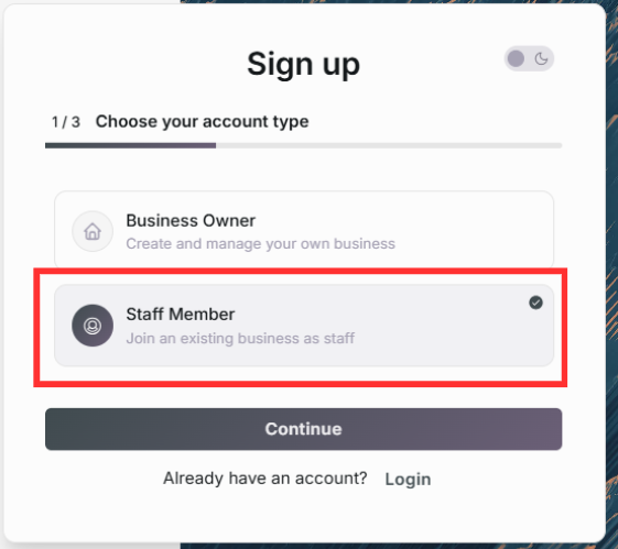 Wenn du dich als Mitarbeiter eines bestehenden Accounts für ein Geschäft registrieren möchtest, benötigst du zunächst eine Mitarbeitereinladung des bestehenden Accounts. Du wirst dann automatisch diesem Account zugewiesen. Wie man Mitarbeiter einlädt wird unter XXX (TBD) beschrieben.