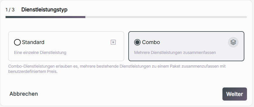 Um eine Kombi-Dienstleistung zu erstellen, müssen bereits mindestens zwei Dienstleistungen in deiner Filiale existieren, um Zugriff auf diese Option zu haben. Sobald das der Fall ist, hast du beim Hinzufügen einer neuen Dienstleistung die Möglichkeit, zwischen einer Standard- oder Kombo-Dienstleistung zu wählen.
