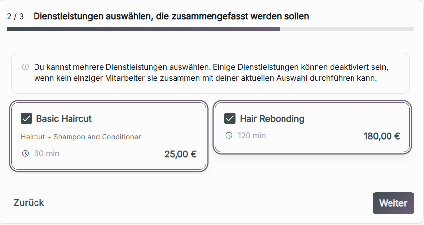 Anschließend wählst du dann die Dienstleistungen aus, die für eine Kombo-Dienstleistung kombiniert werden sollen. Du kannst beliebig viele Dienstleistungen zu einer Kombo-Dienstleistung zusammenfassen.