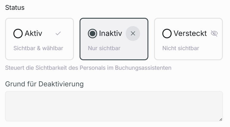 Inaktiv bedeutet, dass der Mitarbeiter nur sichtbar, aber nicht für die Terminbuchung auswählbar ist. Wenn ein Mitarbeiter inaktiv ist, können Sie eine Beschreibung schreiben, die im Buchungsassistenten anzeigt, warum er nicht buchbar ist (z.B. "Elternzeit").