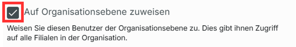 Du kannst die Zuweisung auf die Organisationsebene (Zuweisung zu allen Filialen) entfernen oder hinzufügen. Wenn du bei der Bearbeitung eines Mitarbeiters die Zuweisung zur Organisationsebene entfernst, verbleibt die Zuweisung des Mitarbeiters lediglich für die Filiale, in deren Ansicht du diese Änderung vorgenommen hast.