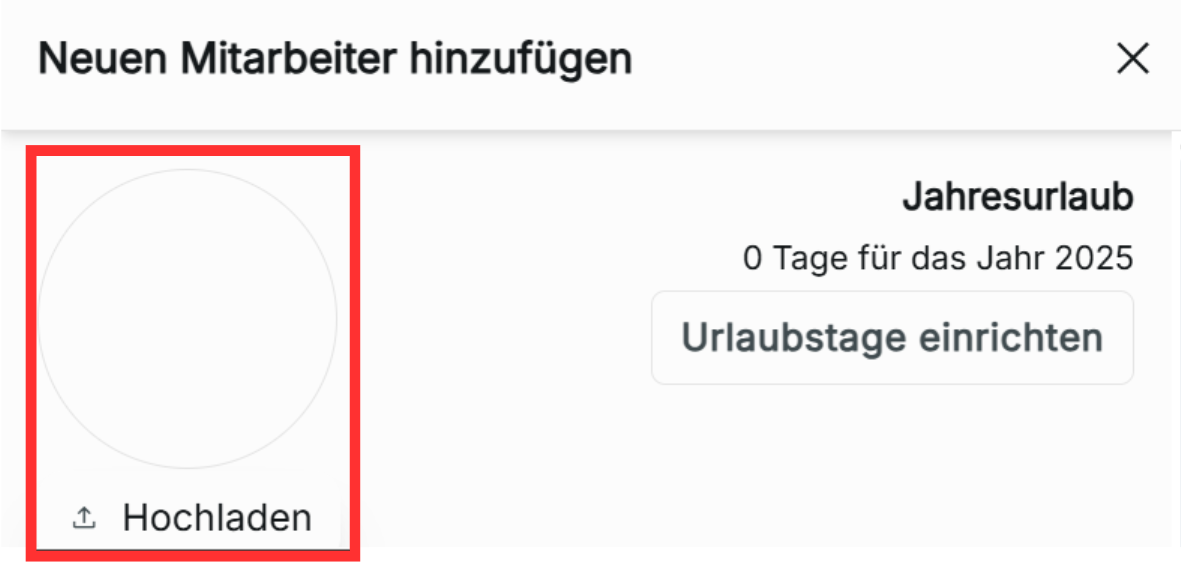 Um ein Mitarbeiter-Profilbild hochzuladen, klicken Sie auf das Profilbild (bzw. bei neuen Mitarbeitern den leeren Kreis) oben links im Popup-Fenster und dann auf Hochladen. Wähle in dem sich öffnenden Uploadfenster aus deinen Dateien das gewünschte Profilbild aus. Du kannst nun den kreisförmigen Ausschnitt durch Ziehen mit gedrückter Maustaste an den neun äußeren Punkten verändern. Durch Ziehen mit gedürckter Maustast auf dem Ausschnitt selbst kannst du ihn verschieben. Über dem Bearbeitungsfeld siehst du immer eine Vorschau deiner Änderungen. Wenn dufertig bist, klicke Speichern, um zu aktualisieren.