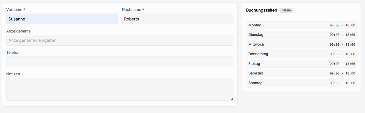 Versteckt bedeutet, dass der Mitarbeiter nicht im Buchungsassistenten sichtbar ist. Das kann beispielsweise bei Mitarbeitern der Fall sein, die mehreren Filialen zugewiesen sind und temporär nicht in der aktuellen Filiale arbeiten.