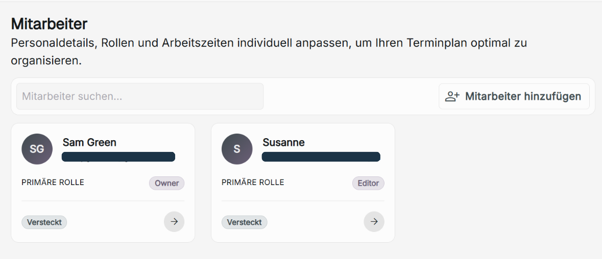 Beachte: Das Bearbeiten von Mitarbeitern kann nur von der Admin- oder Inhaber-Rolle durchgeführt werden (außer der Änderungen, die Mitarbeiter an ihrem eigenen Profil selbst durchführen können, z.B. der persönlichen Informationen)