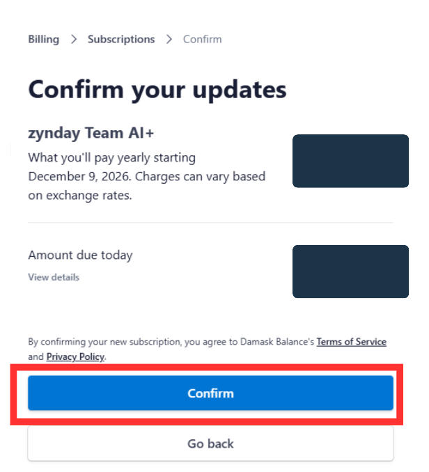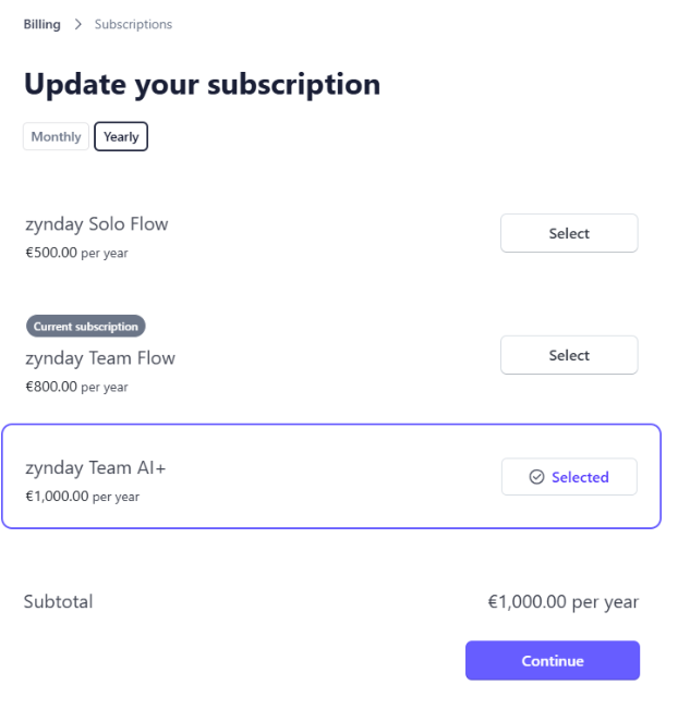 Du kannst jederzeit ein anderes Abonnement wählen, je nach deiner beruflichen Situation. CHECKEN: Die Änderungen gelten sofort und die Abrechnung wird anteilig angepasst. Klicke dafür Abonnement aktualisieren und wähle das gewünschte zynday-Paket aus. Klicke auf Weiter, um fortzufahren.