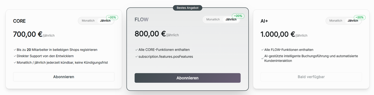 Team – Wähle zwischen Core, Flow oder AI+. Registrierung von bis zu 20 Mitarbeitern über beliebige Filialen.